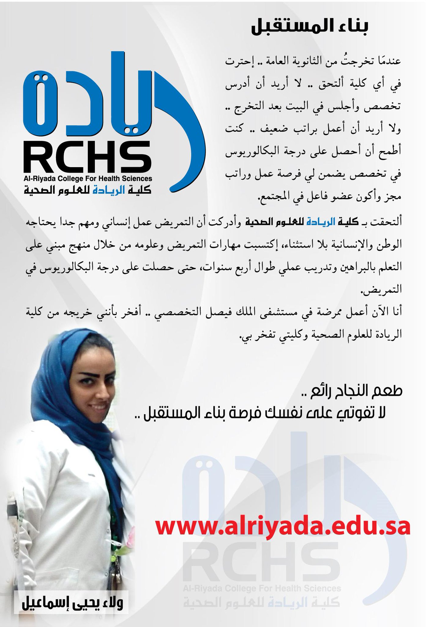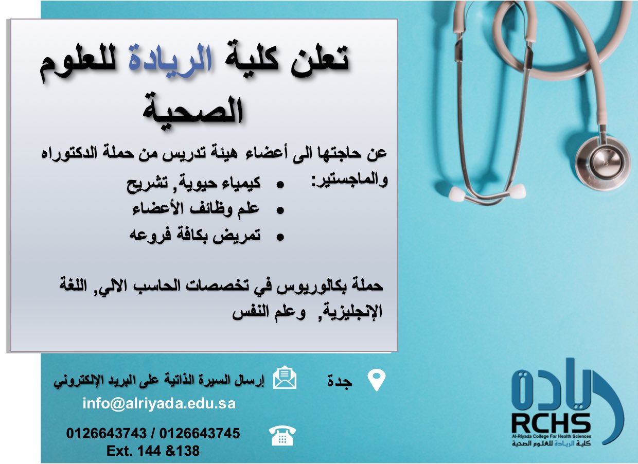 عدد أعضاء هيئة التدريس. كلية الريادة للعلوم الصحية شهادة بكالوريوس معتمدة في علوم التمريض طرق تدريس تعتمد على الأدلة والبراهين تعاون مع نخبة من المستشفيات الكبرى بجدة برنامج التجسير لخريجات الدبلوم. الكليات الأقسام العلمية. أعلنت كلية الريادة للعلوم الصحية توفر عن حاجتها الى أعضاء هيئة تدريس من السعوديات من حملة الماجستير أو الدكتوراه في تخصص التشريح anatomy وذلك وفقا لطريقة التقديم الموضحة أدناه.